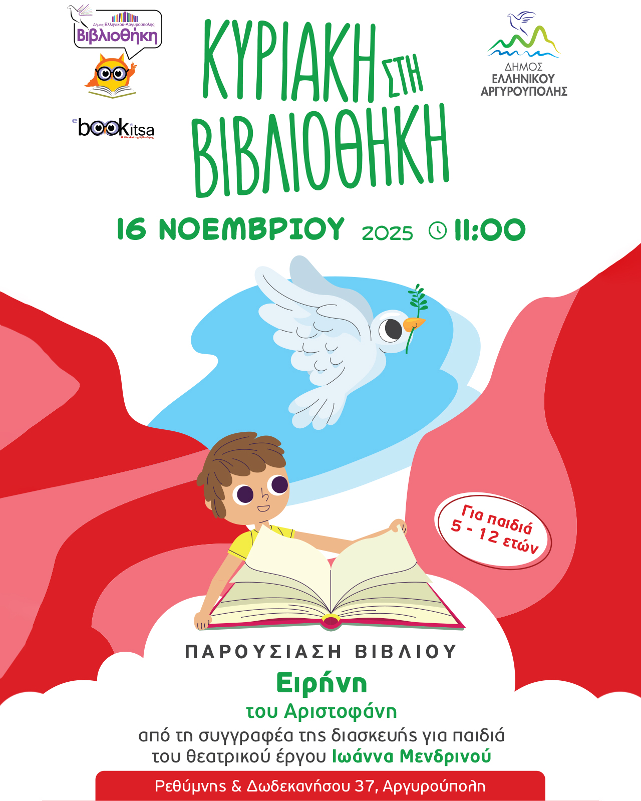 Κυριακή 16 Νοεμβρίου – Παρουσίαση του βιβλίου «Ειρήνη» του Αριστοφάνη στη Δημοτική Βιβλιοθήκη Ελληνικού – Αργυρούπολης
