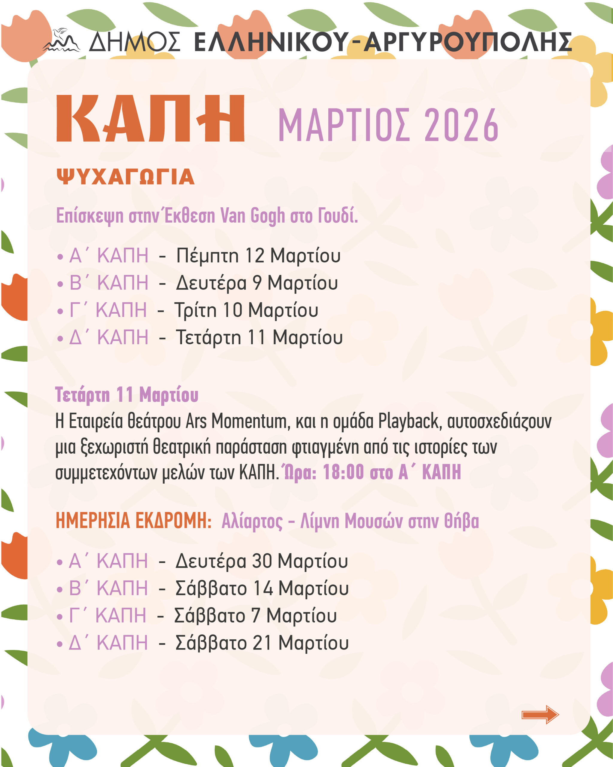 Πρόγραμμα Δράσεων Μαρτίου 2026 για τα 4 ΚΑΠΗ της πόλης μας