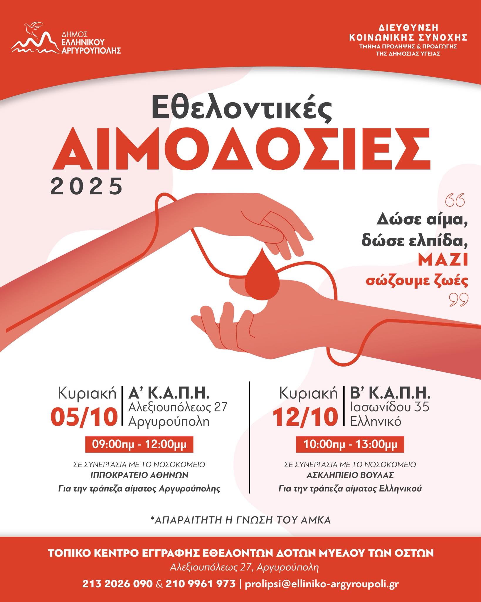 Πρόσκληση συμμετοχής στις εθελοντικές αιμοδοσίες του Δήμου Ελληνικού – Αργυρούπολης