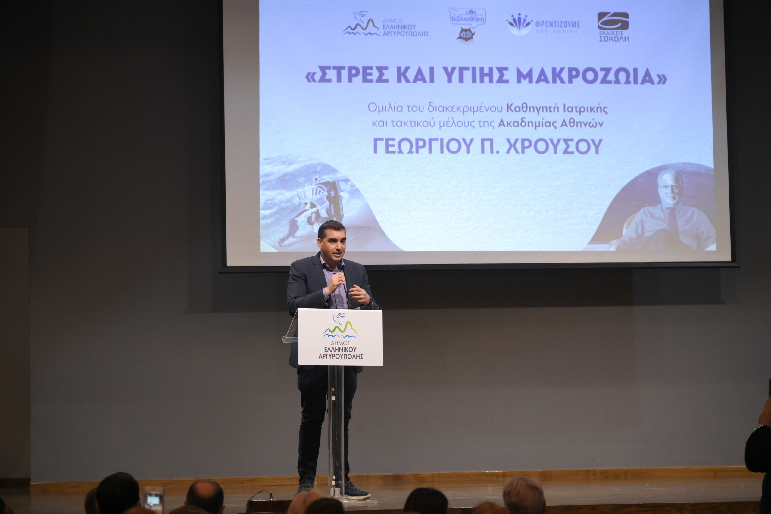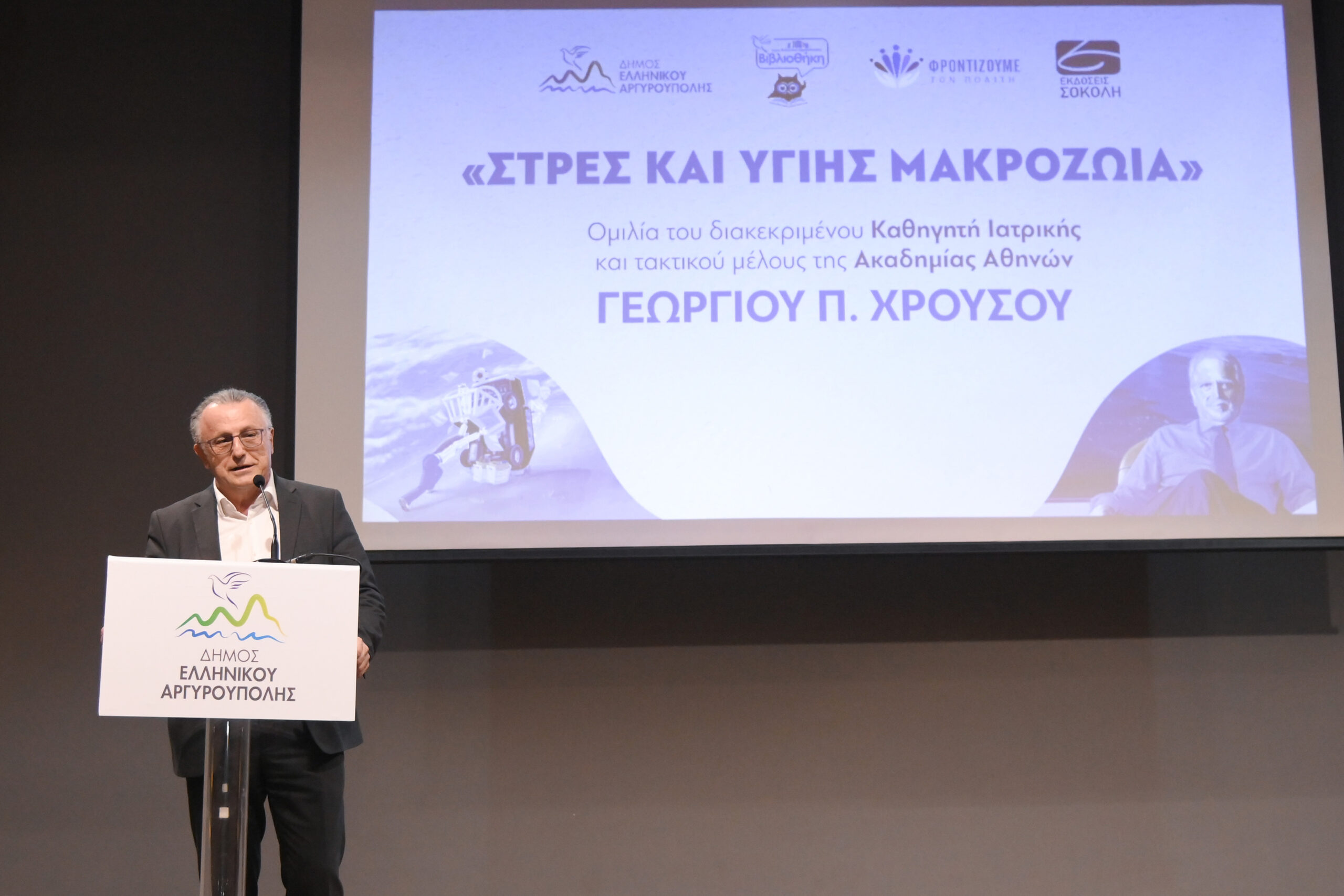 Την Παρασκευή 6 Φεβρουαρίου ο Δήμος Ελληνικού – Αργυρούπολης είχε την ιδιαίτερη τιμή να φιλοξενήσει στο Πολιτιστικό Κέντρο Ελληνικού «Ελένη Γλύκατζη Αρβελέρ» τον διακεκριμένο Ακαδημαϊκό Γεώργιο Π. Χρούσο σε μια πολύ ενδιαφέρουσα και επίκαιρη διάλεξη με τίτλο «Στρες και Υγιής Μακροζωία».