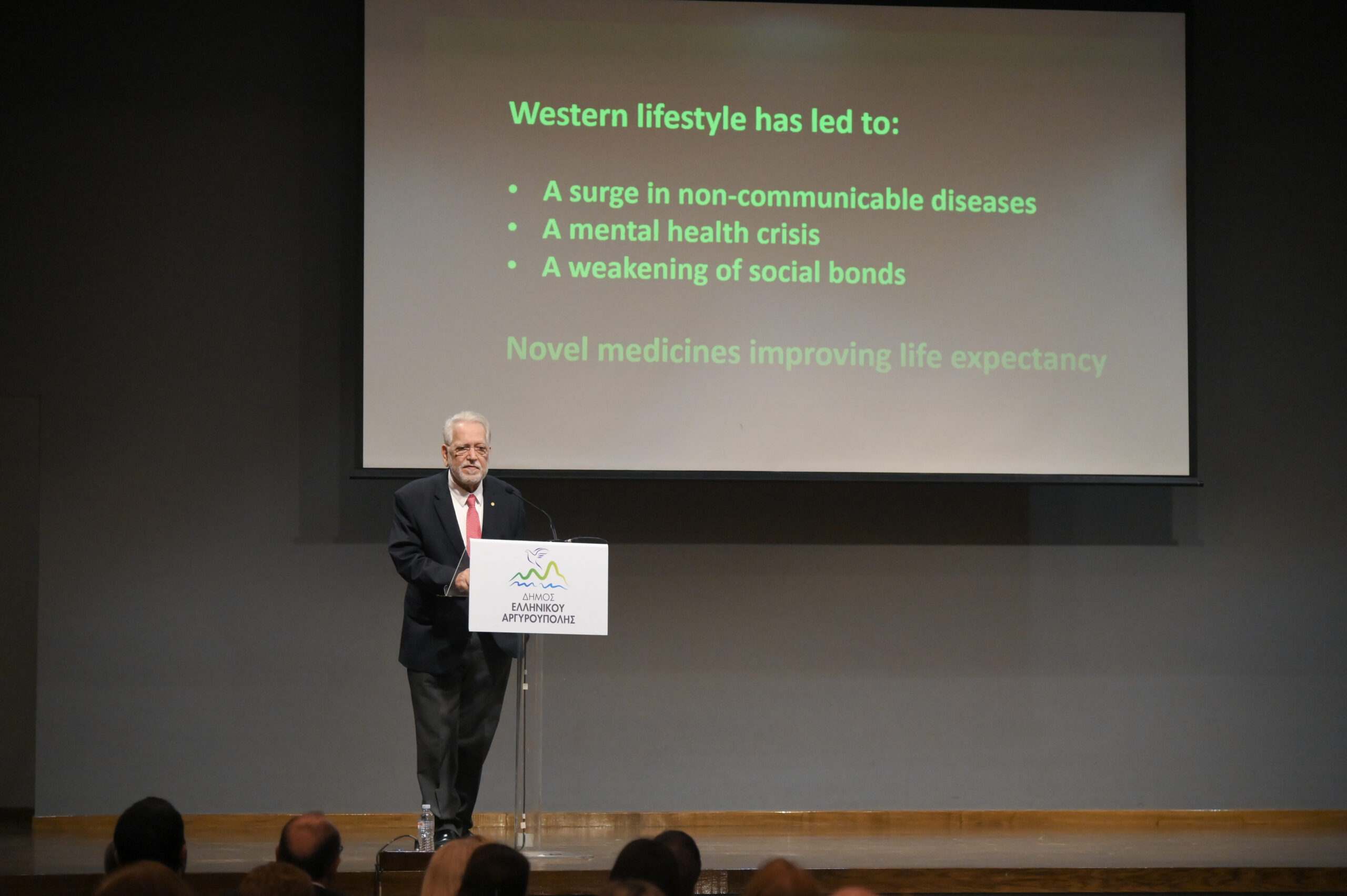 Παρουσία πλήθους πολιτών, επιστημόνων και εκπροσώπων του Δήμου, ο κ. Χρούσος ανέπτυξε με επιστημονική τεκμηρίωση τη στενή σχέση ανάμεσα στο στρες, την υγεία και τη μακροζωία, επισημαίνοντας ότι η ποιότητα και η διάρκεια της ζωής συνδέονται άμεσα με τον τρόπο ζωής, την πρόληψη και τη φροντίδα του εαυτού από νεαρή ηλικία. Παρουσιάζοντας σύγχρονα ερευνητικά δεδομένα, τόνισε πως η σωματική δραστηριότητα, η ισορροπημένη διατροφή, η ψυχική ανθεκτικότητα και οι ισχυροί κοινωνικοί δεσμοί αποτελούν βασικούς πυλώνες ευεξίας, ενώ κοινωνίες που επενδύουν στη γνώση, στην αλληλεγγύη και στη συστηματική πρόληψη καταγράφουν υψηλότερα επίπεδα υγείας και προσδόκιμου ζωής.