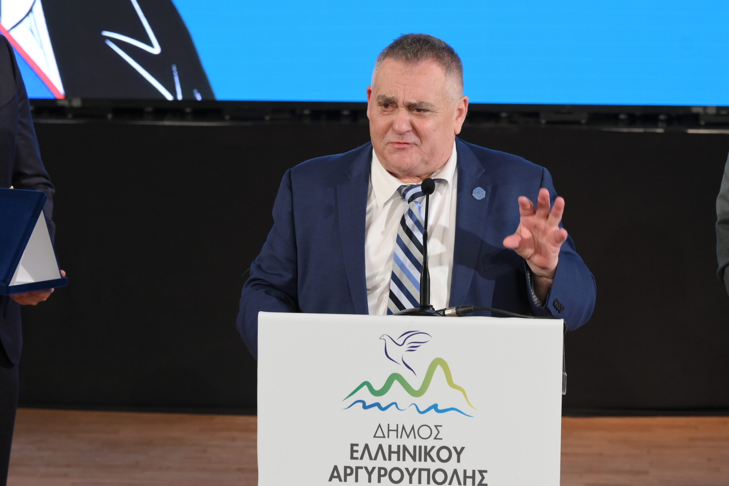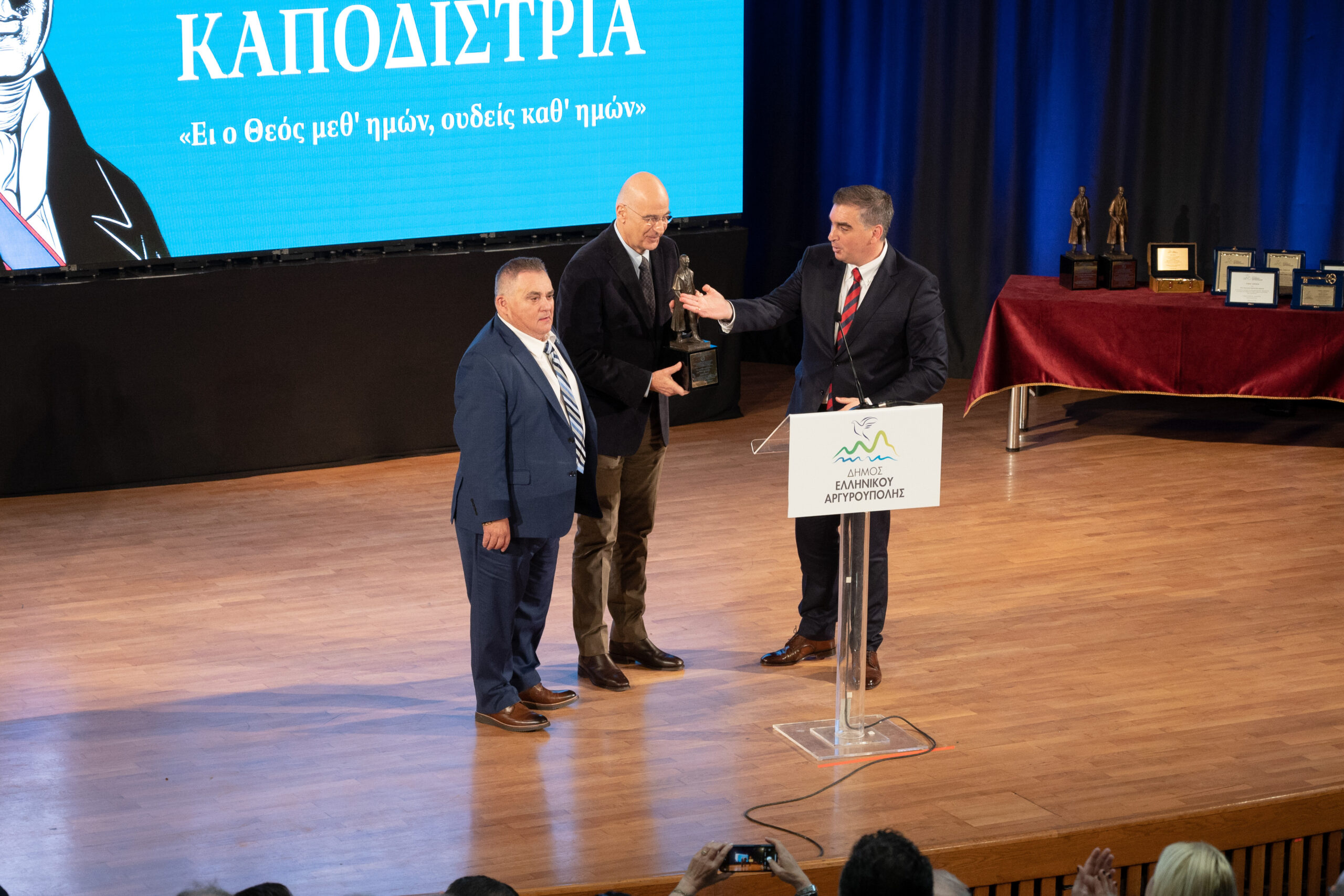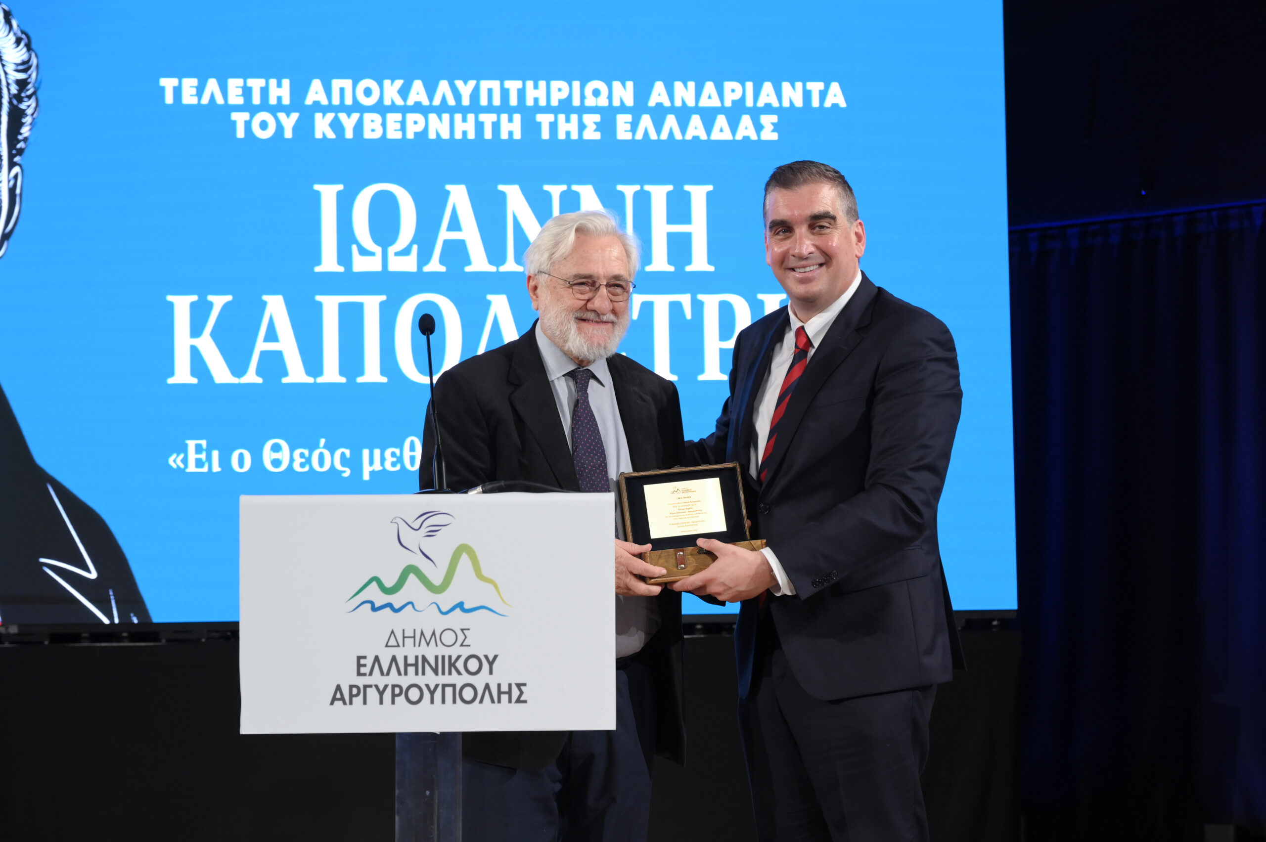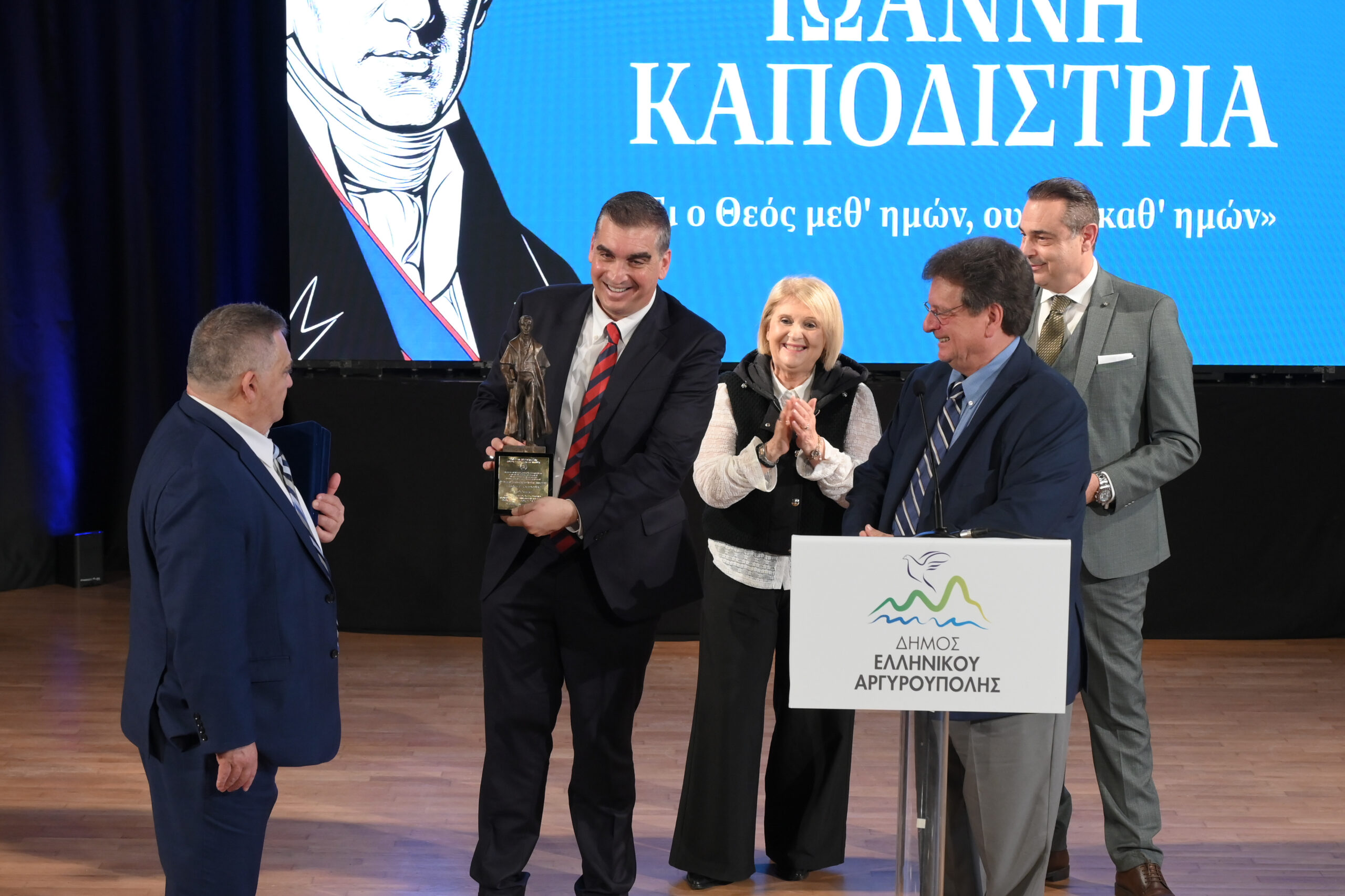 Κορυφαία επίσης στιγμή της εκδήλωσης αποτέλεσε η βράβευση του μεγάλου Έλληνα Γλύπτη που φιλοτέχνησε τον Ανδριάντα του Ιωάννη Καποδίστρια κ. Γιάννη Μπάρδη, ο οποίος με πρωτοβουλία του Δημάρχου Ελληνικού – Αργυρούπολης ανακηρύχθηκε ως επίτιμος Δημότης του Δήμου.