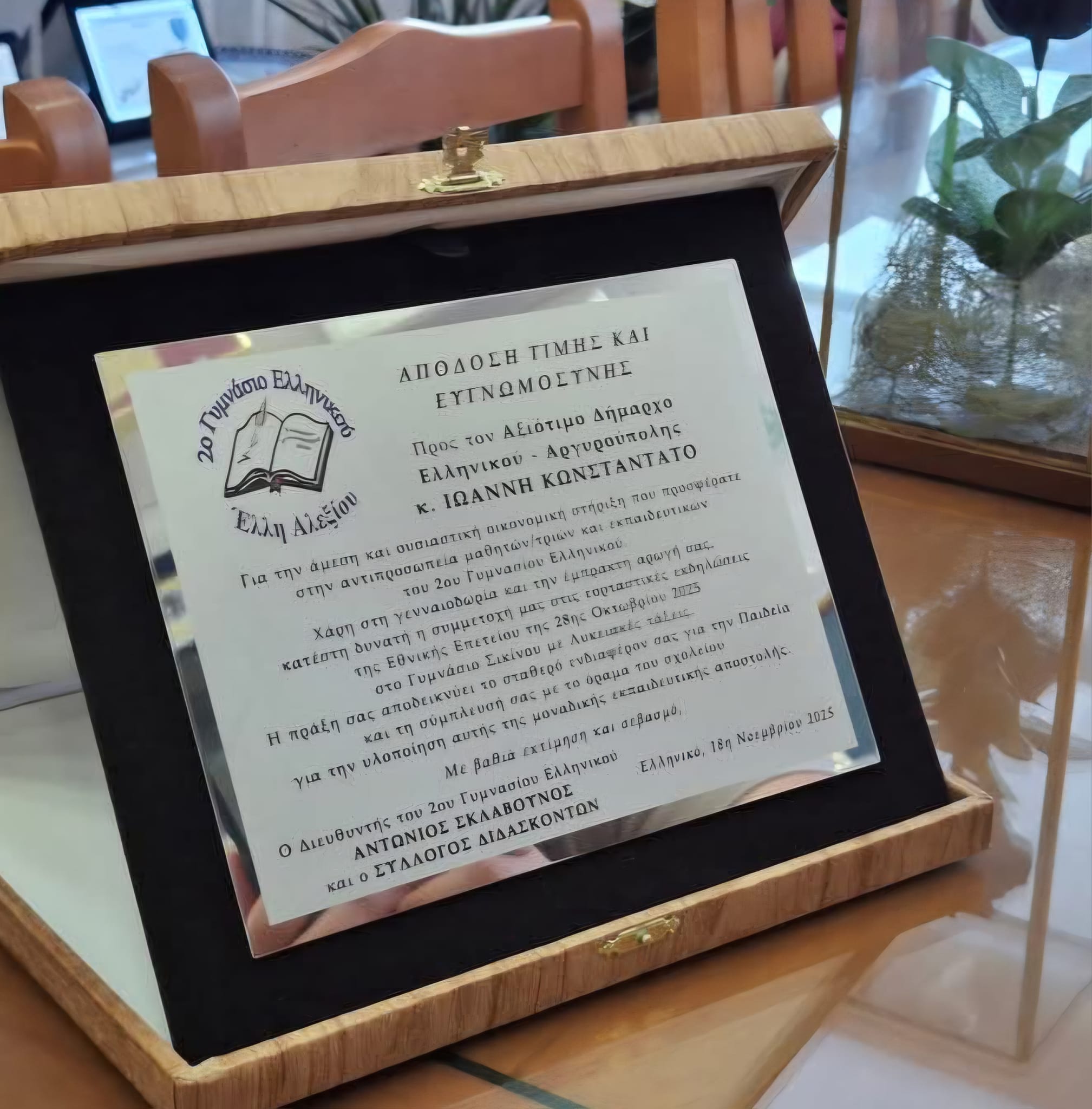 Κατά τη διάρκεια της συνάντησης, οι μαθητές προσέφεραν στον Δήμαρχο τιμητική πλακέτα για τη στήριξη που παρείχε, καθώς ανταποκρίθηκε άμεσα στο αίτημά τους για να γίνει πραγματικότητα το ταξίδι. Ο Δήμαρχος, ευχαριστώντας τους, υπογράμμισε ότι η πλακέτα αυτή ανήκει στα ίδια τα παιδιά, στις οικογένειές τους, στον Διευθυντή κ. Σκλαβούνο, στους εκπαιδευτικούς και στον Σύλλογο Γονέων και Κηδεμόνων, που στήριξαν μια δράση με ουσιαστικό παιδαγωγικό και κοινωνικό αποτύπωμα. Η πλακέτα θα παραμείνει στο Δημαρχείο για να θυμίζει σε όλους πόσο σημαντικό είναι να στηρίζουμε δράσεις που ενώνουν τους νέους μας, που χτίζουν γέφυρες και αναδεικνύουν τις αξίες της συνεργασίας και της ανθρωπιάς.