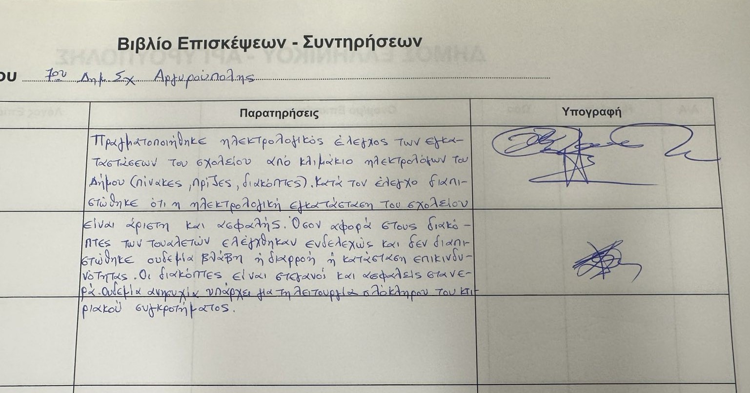 Ο ηλεκτρολογικός πίνακας του σχολείου είναι σε άριστη κατάσταση, δεν σημειώθηκε καμία πτώση ρελέ διαφυγής, κανένα μπλακ άουτ και κανένα βραχυκύκλωμα. Οι δε έλεγχοι που πραγματοποιήθηκαν επιβεβαίωσαν πλήρως την ασφαλή λειτουργία της εγκατάστασης. (ΠΑΤΗΣΤΕ ΓΙΑ ΝΑ ΔΙΑΒΑΣΕΤΕ ΑΝΑΛΥΤΙΚΑ ΤΗΝ ΕΚΘΕΣΗ ΤΩΝ ΗΛΕΚΤΡΟΛΟΓΩΝ)